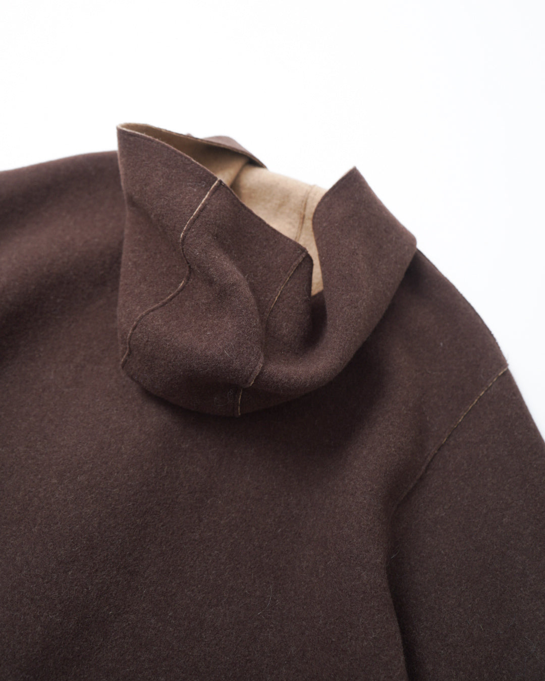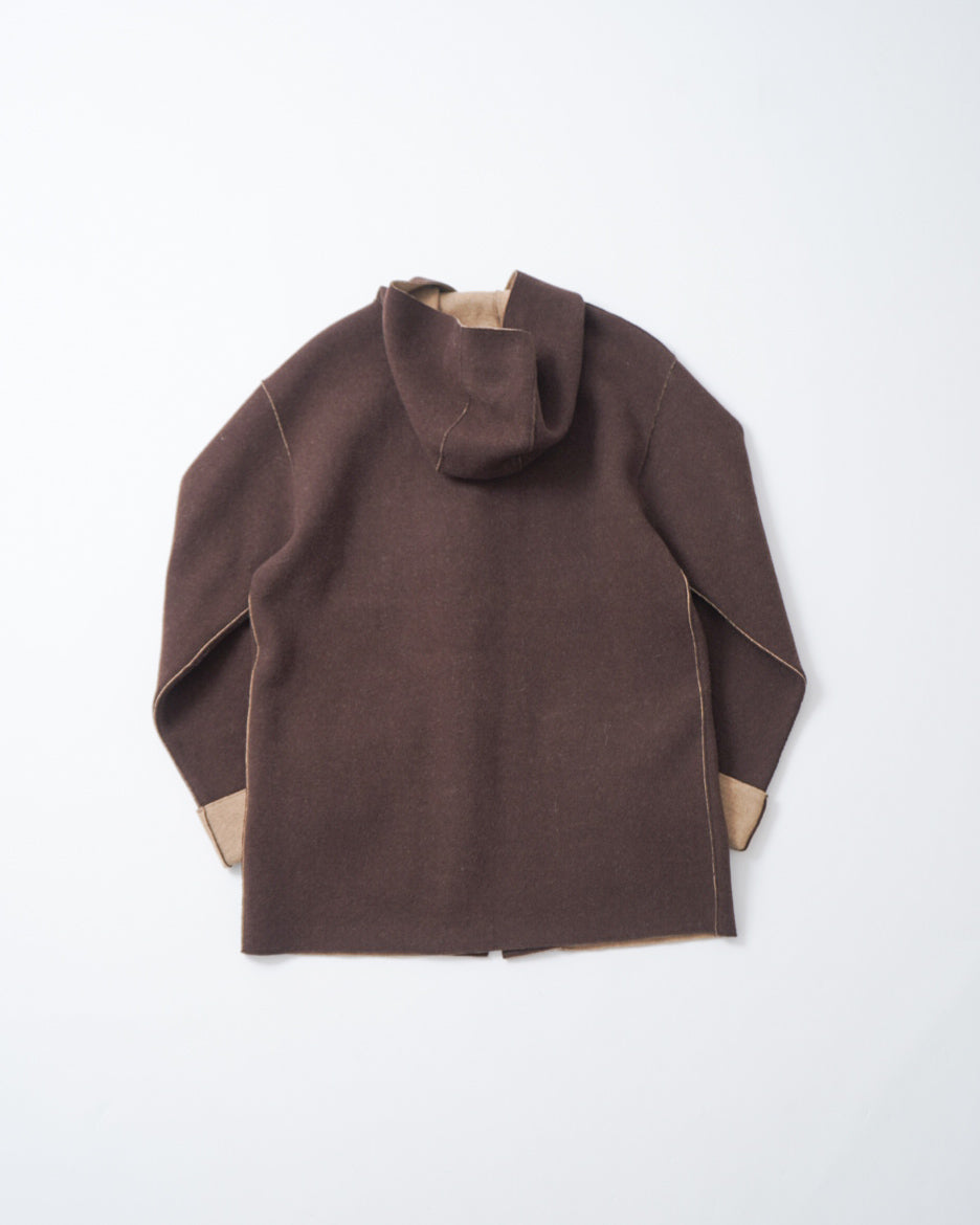 ブラウンとベージュのツートンカラーが印象的で、裏地や袖口の折り返しから覗く配色がアクセント